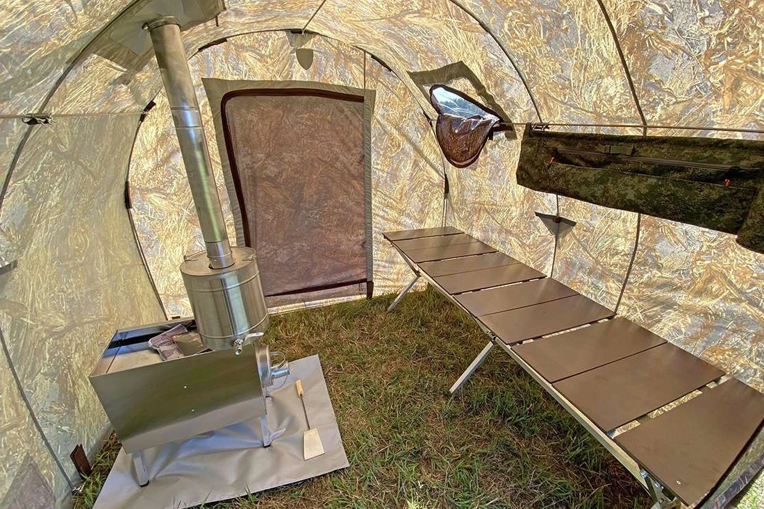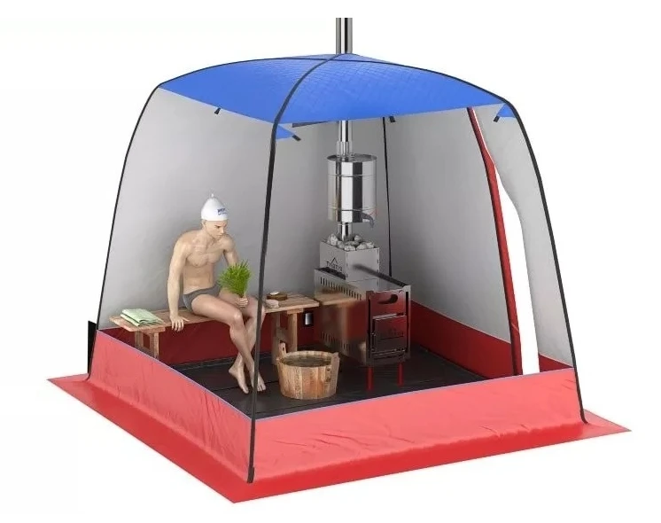 Важно учитывать, что баня-палатка отличается от стандартной зимней палатки – фактором печки. В современной вариации отопительный прибор позволяет быстро прогреть пространство внутри шатра до +100 °C.