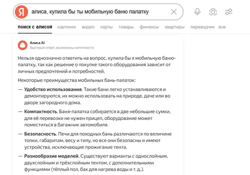 Мы спросили у небезызвестной Алисы, готова ли она купить мобильную баню-палатку, и вот что получили в ответ: